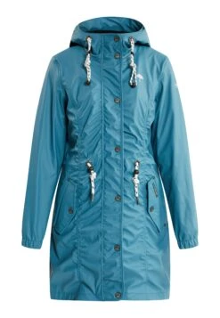 Für jedes Wetter gerüstet sein, ist mit diesem 3 in 1 Regenmantel von Schmuddelwedda kein Problem. Die knielange Außenjacke bietet mit der eingesetzten, kürzeren Innenjacke vielseitige Tragevarianten. So empfiehlt es sich bei Regen und Kälte den Regenmantel plus Fleece-Innenjacke zu tragen. Dank einer Beschichtung und verklebten Nähten ist die Jacke wind- und wasserabweisend. Der Reißverschluss wird mit einer Druckknopfleiste verdeckt und endet in einem hoch schließenden Kragen, der in die Kapuze mit dekorativem Tunnelzug übergeht. Sollte es nicht regnen und Sie brauchen nur schnell eine Jacke zum Überziehen, dann können Sie die Fleece-Innenjacke auch solo tragen. Dies macht ein Reißverschluss im Nu möglich. Für den Regenschauer an warmen Tagen wird der Regenmantel am besten ohne Innenjacke getragen. Der charakteristische Logo-Regenschirm-Print auf der Brust und die vielen, detailverliebten Accessoires komplettieren den Schmuddelwedda-Look.